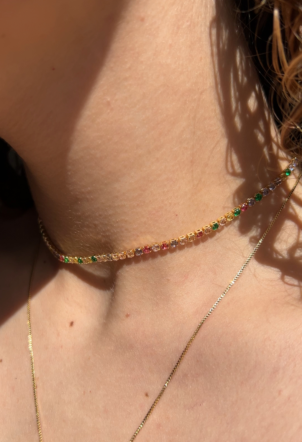 A Choker Riviera é o acessório perfeito para quem busca delicadeza, cor e personalidade em um único item. Confeccionada com zircônias cuidadosamente aplicadas, cada pedrinha traz leveza e brilho ao visual, tornando a peça ideal para: Usar sozinha em um look minimalista ou combinar com outros colares em um mix moderno e poderoso.