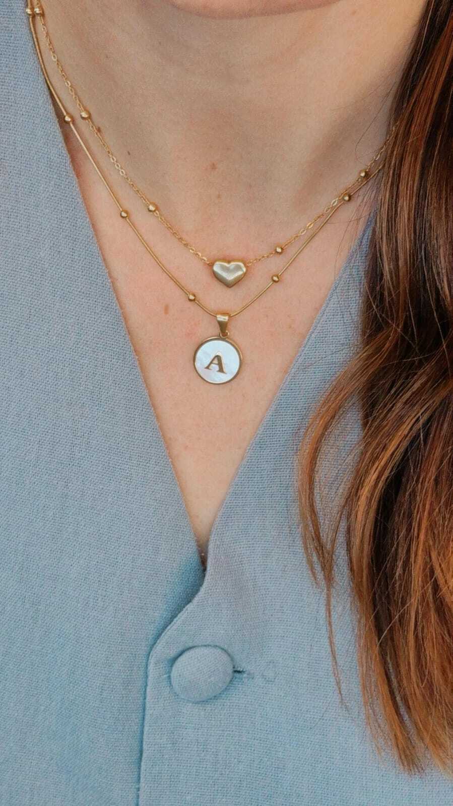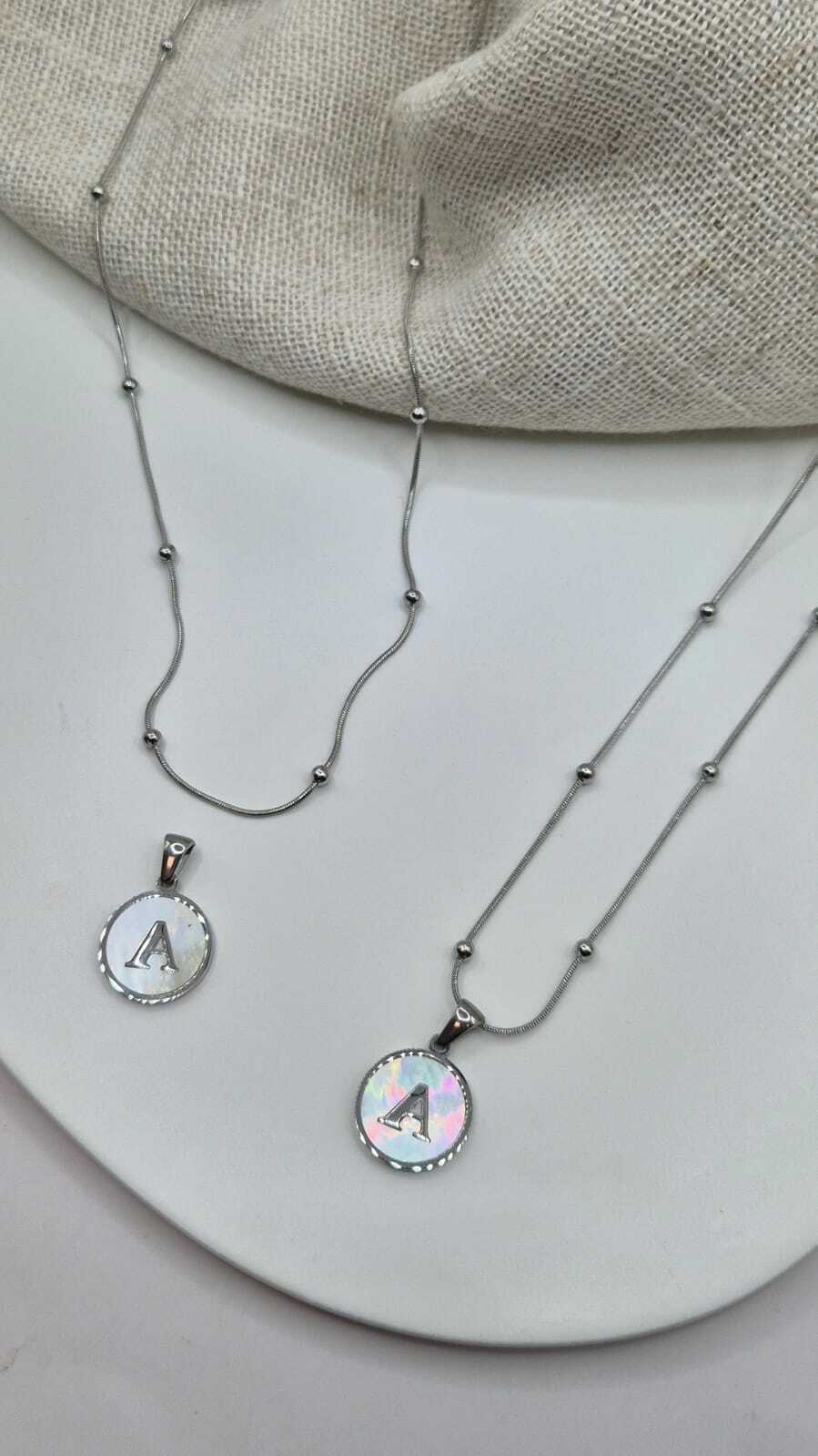 O pingente é uma plaquinha redonda com uma letra ao meio no fundo de madreperola, super fofo e delicado.